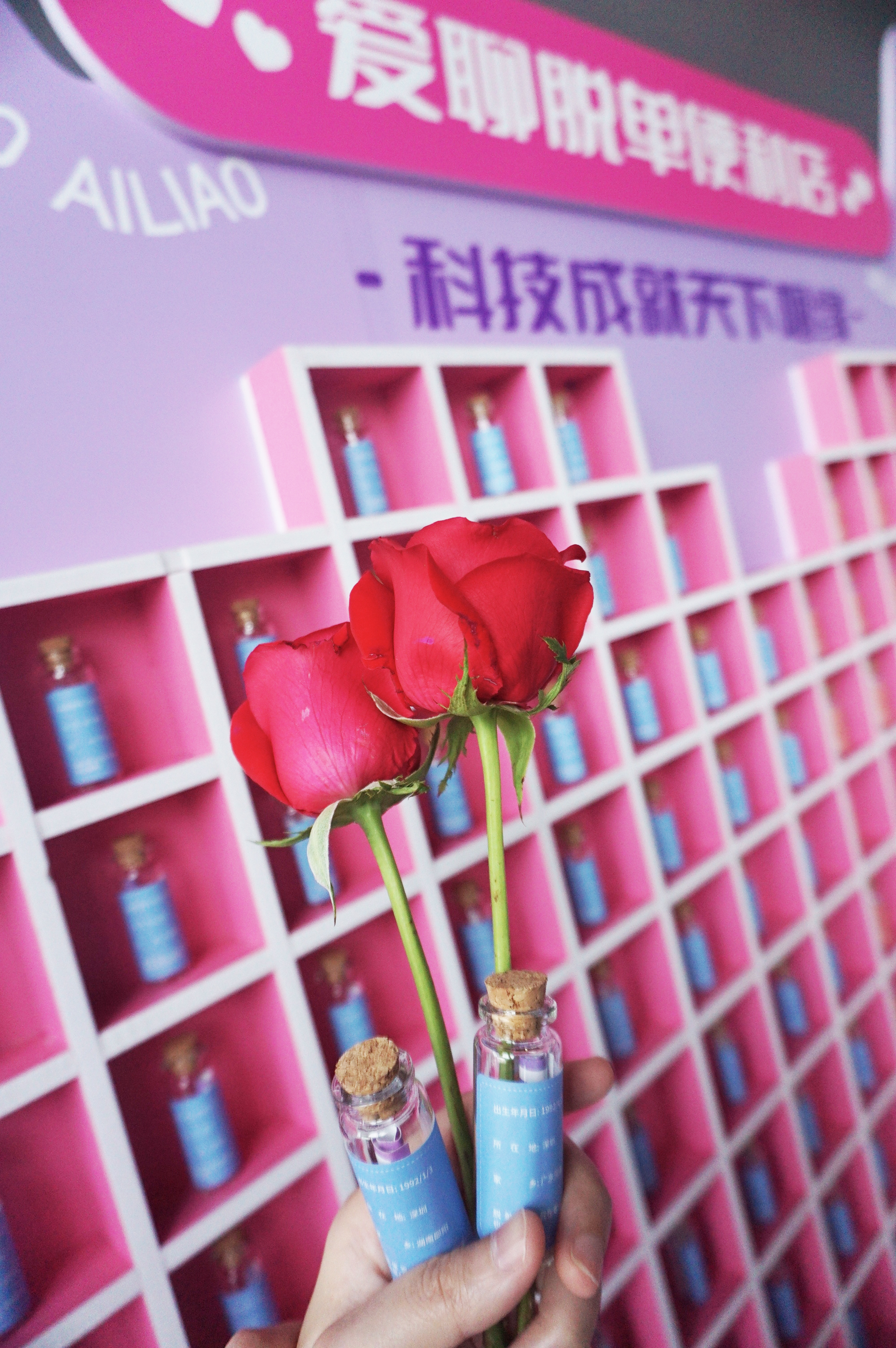 满墙的脱单瓶以月份为分类搭建为超具浪漫色彩的爱心形状,并根据男女性别分为蓝、粉两色,脱单瓶外展示了用户生日、家乡、个性签名等基本信息。来访的人员只需扫码下载爱聊 APP 即可填写信息放入脱单瓶,或从爱心墙中领取中意的脱单瓶,让“爱情转角来相遇,主动就会有故事”的美好憧憬得以实现。